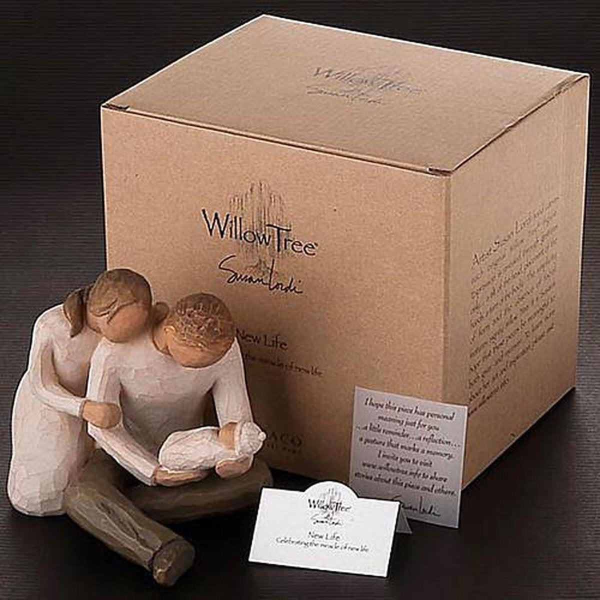 Artist Susan Lordi hand carves the original of each Willow Tree sculpture. Pieces are made in cast stone from her original carvings, and then individually painted by hand with lead-free paint. "I try to keep the interpretation of Willow Tree open. I hope this makes it more personal, and allows the viewer to decide its meaning." - Susan Lordi.