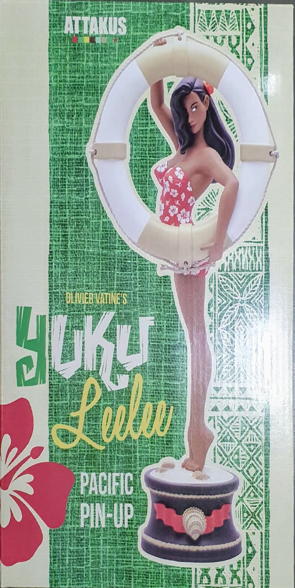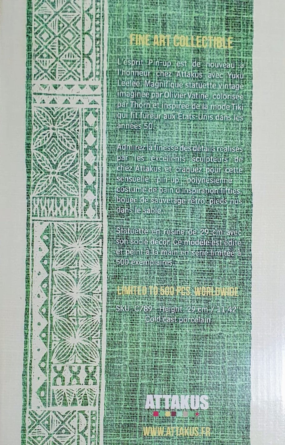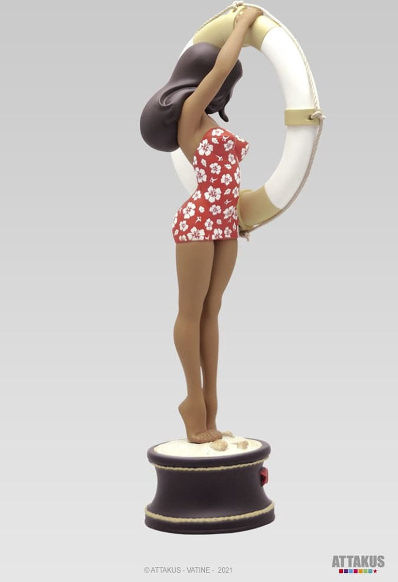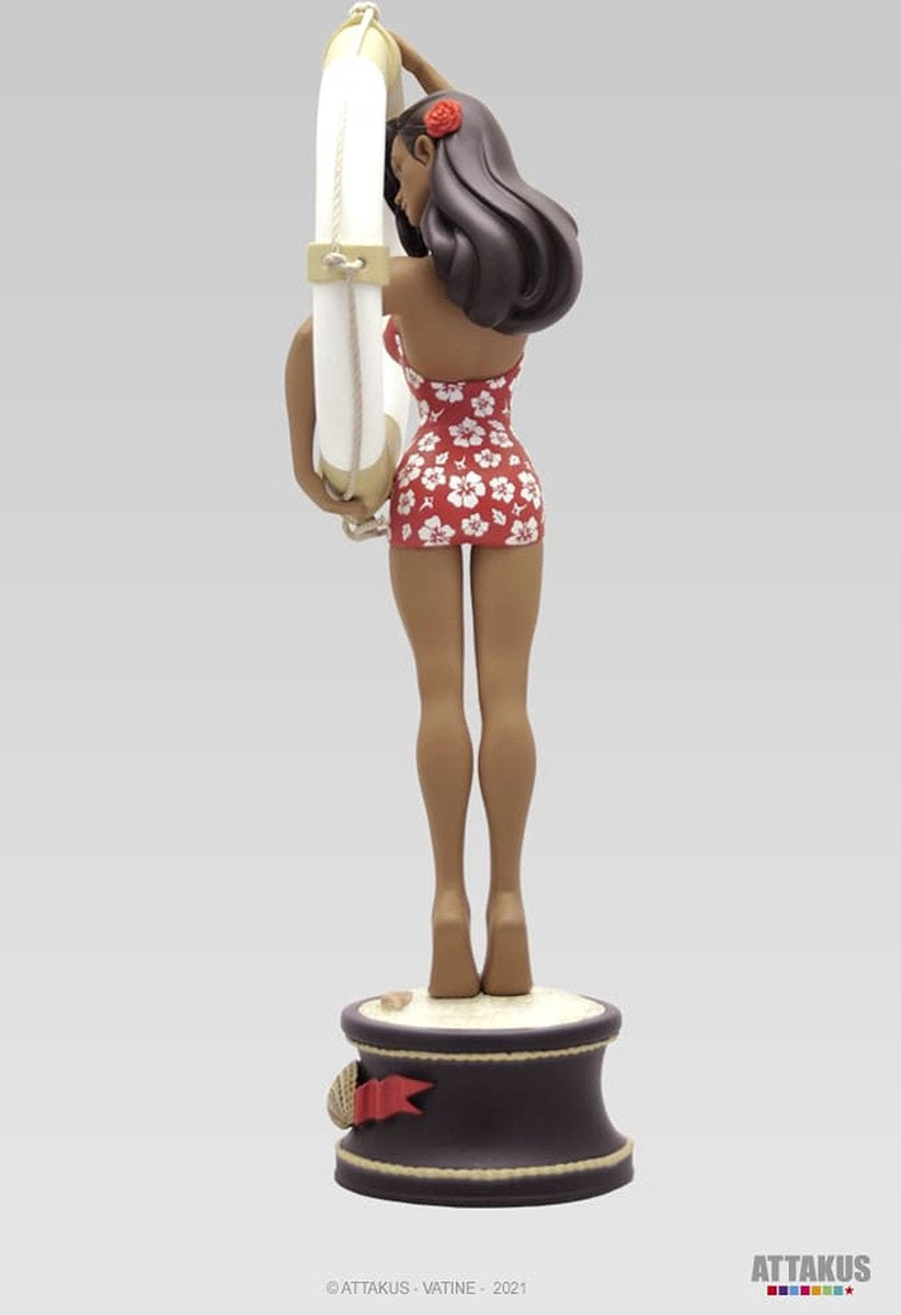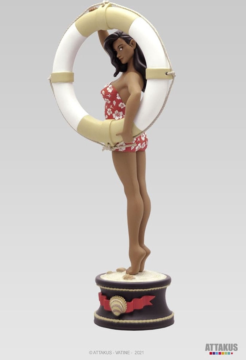 Admire the finesse of the details by the excellent sculptors at Attakus and fall for this sensual Polynesian pin-up: 1950s-inspired swimming costume, retro life buoy, tiare flower in hair, bare feet in the sand...